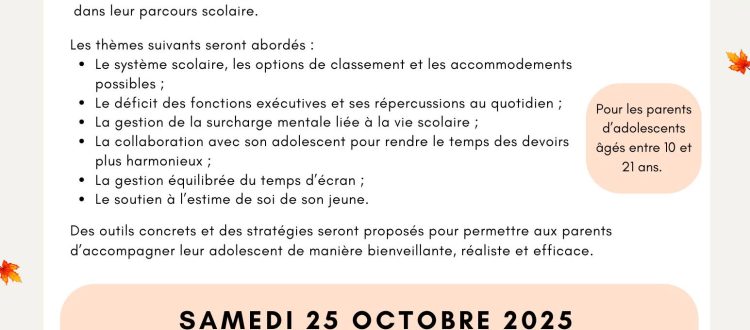 Des outils concrets et des stratégies pratiques seront proposés afin de permettre aux parents d’accompagner leur adolescent de manière bienveillante, réaliste et efficace.