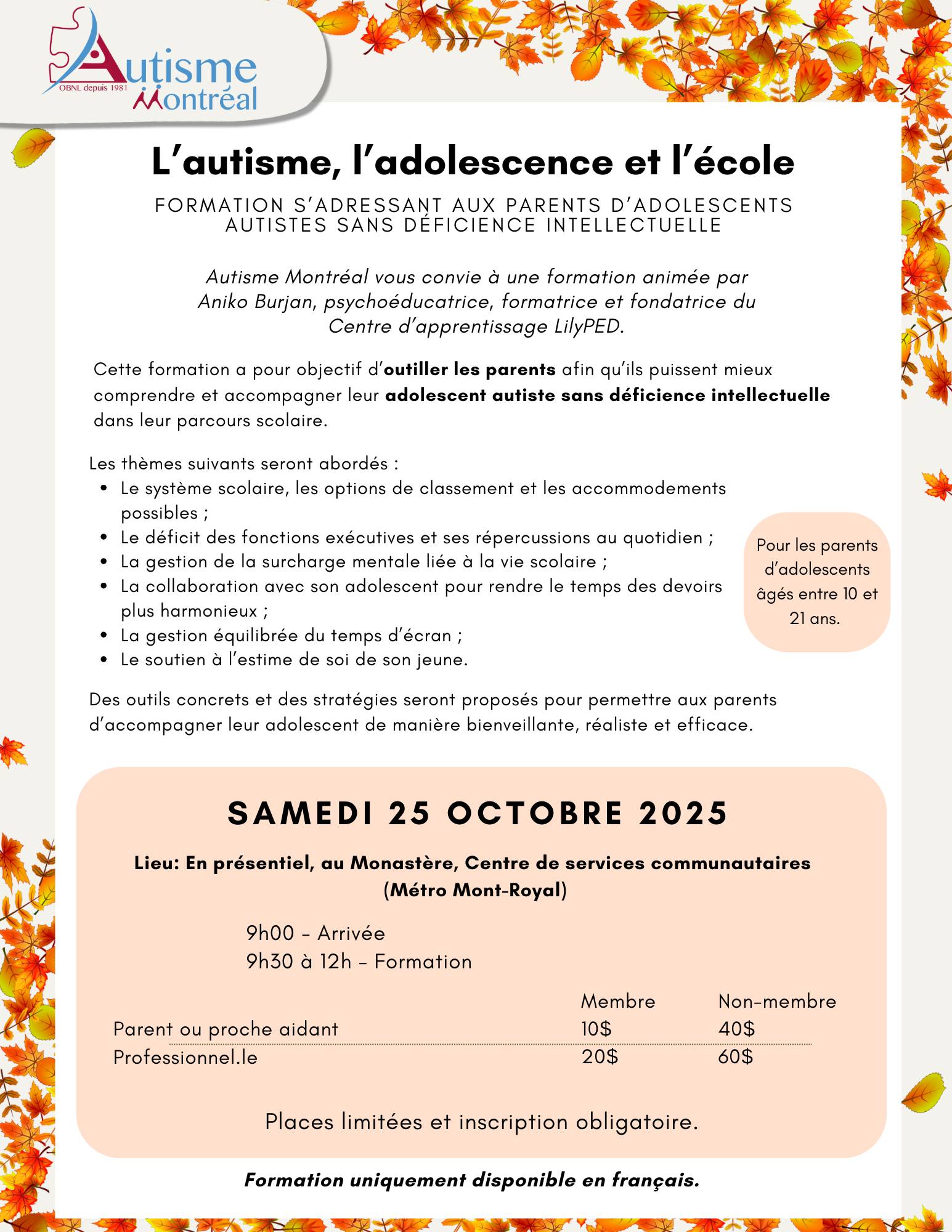 Atelier d’information : L’autisme, l’adolescence et l’école